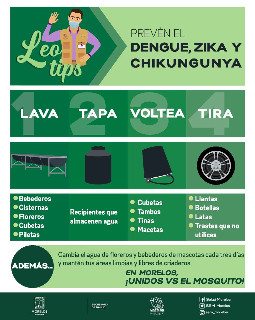 Eduardo Sesma Medrano, coordinador de Vigilancia Epidemiológica de SSM, señaló que se deben lavar con agua, jabón y cepillo: cubetas, piletas, tinacos, cisternas y floreros; tapar todo recipiente que acumule agua; voltear botes, tambos, tinas y macetas; así como tirar botellas, llantas o trastes que no se utilicen.