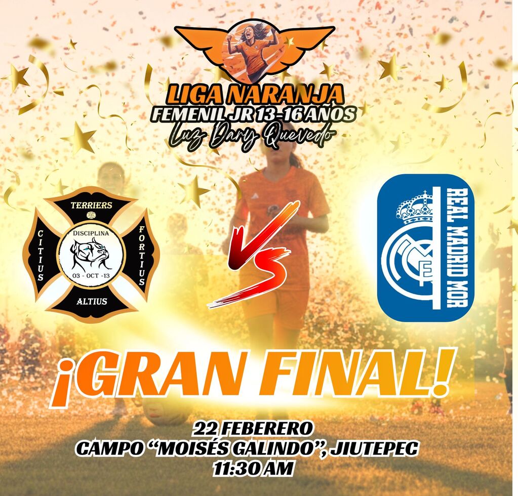 Te invitamos a apoyar a las campeonas en la Gran Final de la Liga Naranja Femenil Jr categoría 13-16 años, donde el equipo Terriers se enfrenta a Real Madrid Mor.
