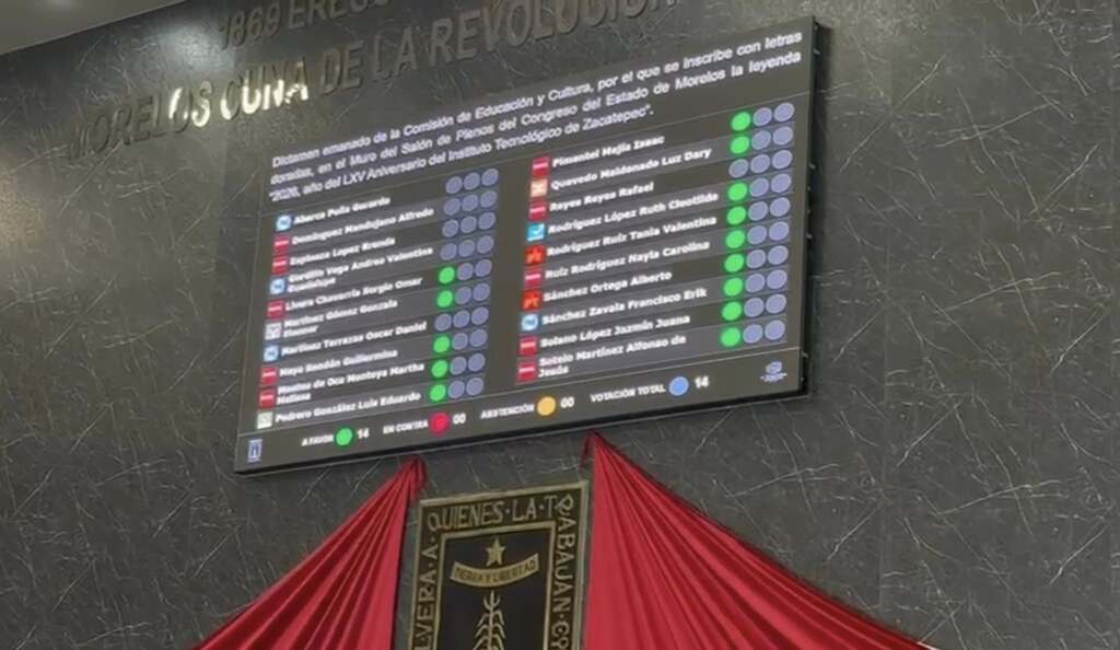 El pleno de la LVI Legislatura del H. Congreso del Estado de Morelos, en desahogo de la sesión celebrada este 11 de marzo de 2026, abordó en el análisis de los dictámenes de segunda lectura, el emanado de la Comisión de Educación y Cultura, por el que se inscribe con letras doradas, en el Muro del Salón del Plenos de esa soberanía, la leyenda “2026, año del LXV Aniversario del Instituto Tecnológico de Zacatepec”.