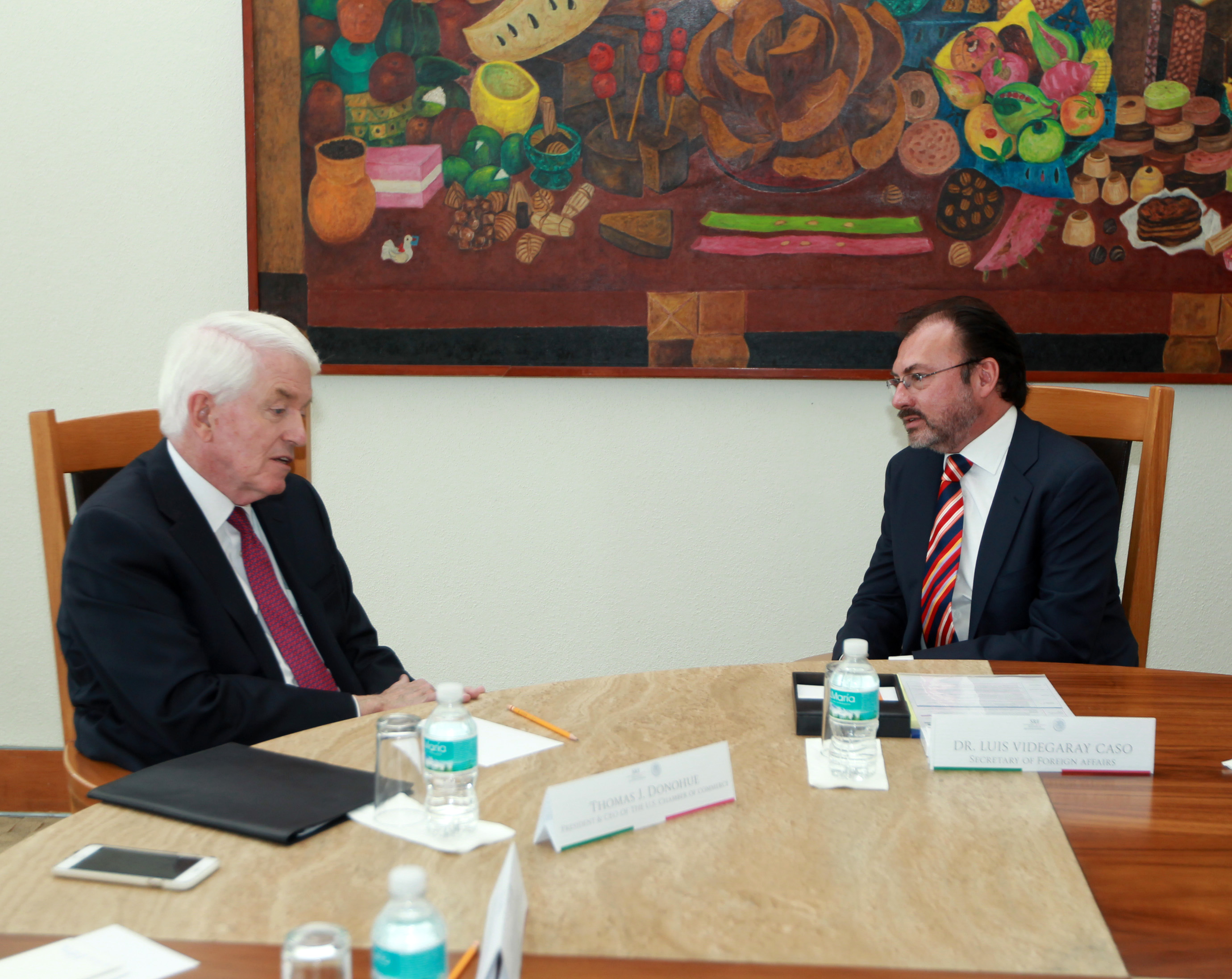 El Secretario de Relaciones Exteriores, Luis Videgaray Caso, se reunió hoy con Thomas Donohue, Presidente de la Cámara de Comercio de Estados Unidos de América, con quien intercambió puntos de vista sobre la relación entre México y aquella nación, en particular sobre cómo fortalecer el comercio bilateral y la agenda de competitividad de América del Norte.