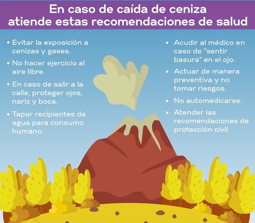“Es importante evitar que la ceniza se acumule en techos ligeros como lámina, cartón, triplay, lona, teja y otros parecidos; sugerimos recogerla en bolsas para que no se vaya al drenaje y no utilizar agua para limpiarla; asimismo también pedimos a la gente mantener tapados tinacos, depósitos con agua y coladeras”, puntualizó.