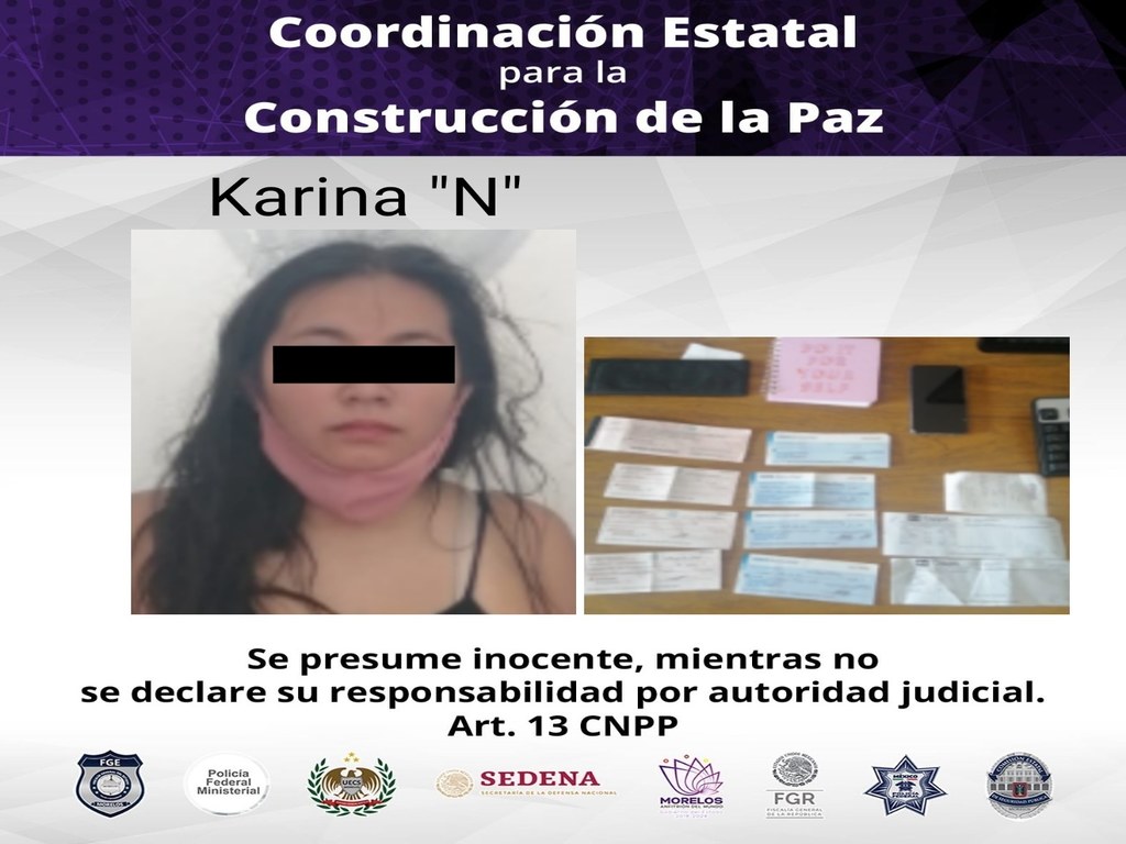 Mediante el señalamiento directo fue detenida quien dijo llamarse Karina “N” de 26 años, a quien al realizarle una inspección se le encontró en posesión una chequera de color negro que en su interior contenía varios cheques con denominaciones diferentes y a nombre de diferentes empresas, la detenida fue puesta a disposición del Agente del Ministerio Público.