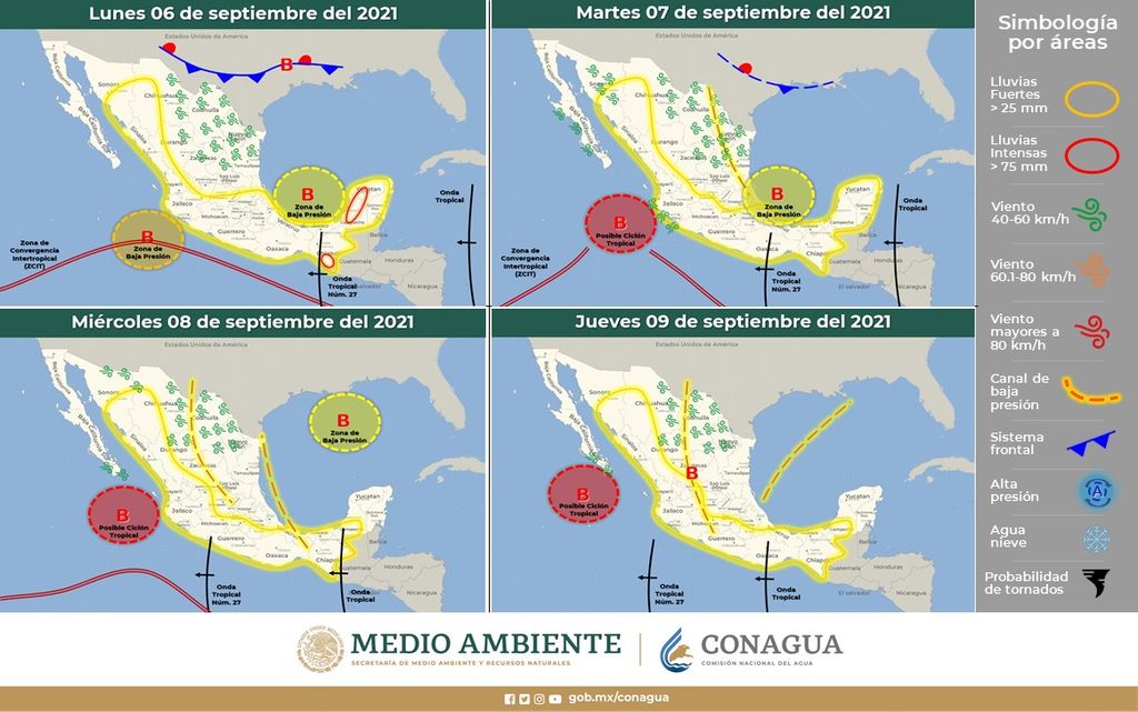 La presencia de perturbaciones tropicales en el Pacífico y el Golfo de México, con probabilidades de desarrollo ciclónico permitirá el ingreso de humedad proveniente de dichas regiones al territorio nacional, lo que sumado a la persistencia de canales de baja presión en el interior, se mantendrá fuerte potencial lluvioso en el país.